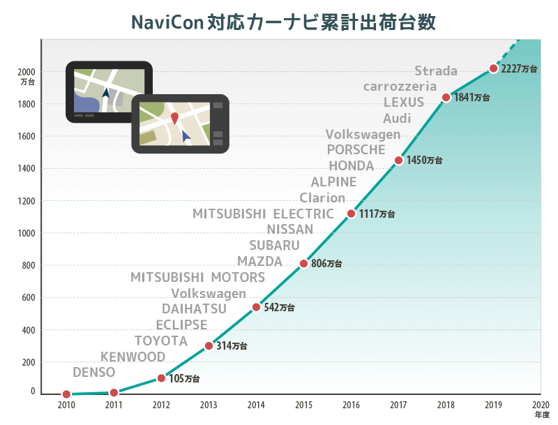 2000万台を超えるカーナビにNaviCon経由で地点情報の送信が可能です。