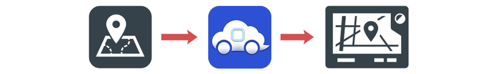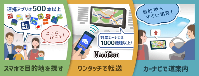 NaviConは、スマホのアプリやWebサイトで探した地点を対応カーナビに転送できるハブアプリです。