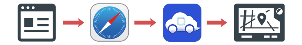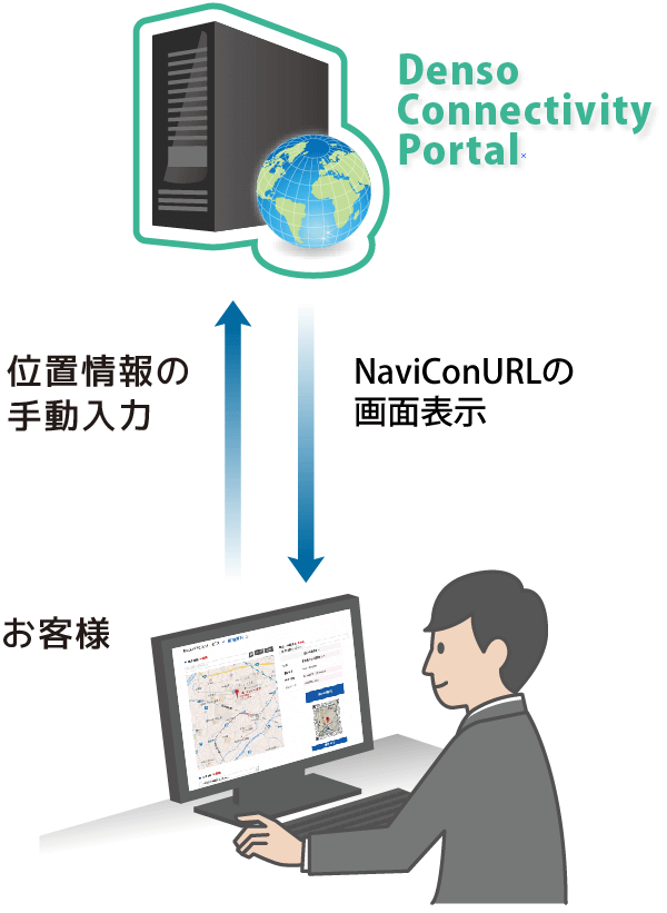 お客様のサイトページにNaviConURLを配置し、WebブラウザからNaviConを起動して、カーナビに地点を設定する。